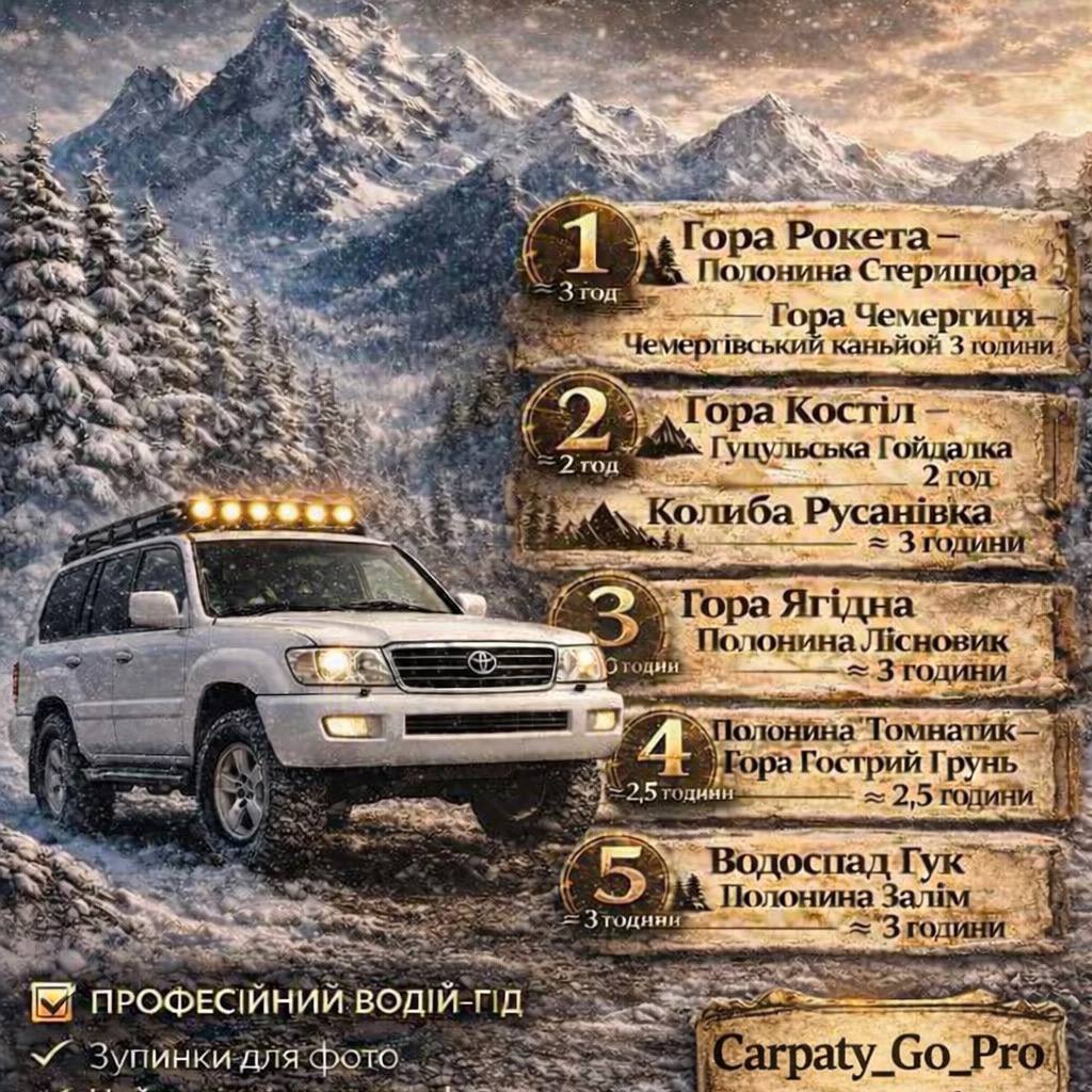 Ми організуємо джип-тури та квадро-екскурсії для компаній, сімей та пар. Є різні маршрути — від легких прогулянок до екстремальних підйомів.
